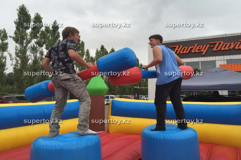 Надувной батут Бои гладиаторов назван в честь масштабных гладиаторских представлений, о которых нам всем известно. Однако здесь одно сплошное веселье и удовольствие! Только представьте, насколько интересно наблюдать за двумя мужчинами, «метелящими» друг друга мягкими дубинками! Участники становятся на специальные помосты, и задача игрока – столкнуть с этого помоста соперника. Аренда батута Бои гладиаторов – прекрасный выбор для активного досуга. Развлечение подарит гостям незабываемые и яркие эмоции – и тем, кто участвует, и тем, кто болеет за своего фаворита. Заказывайте аттракцион Бои гладиаторов в аренду в Алматы в нашей компании.