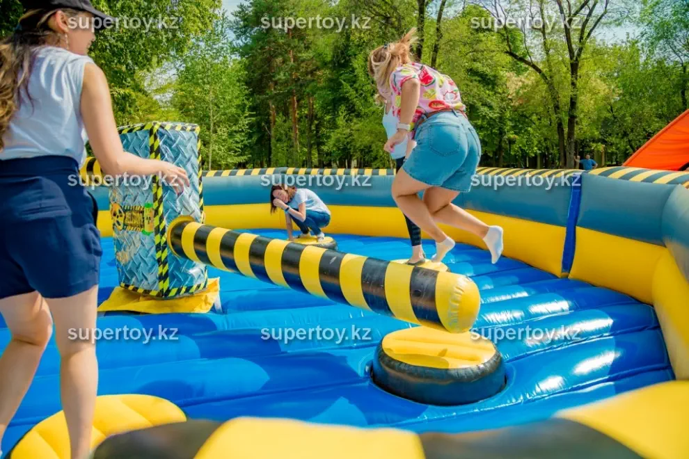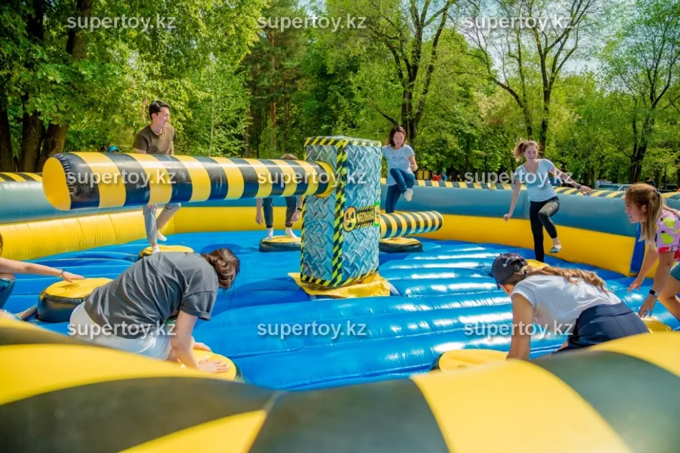 В ваше распоряжение поступает огромная надувная арена диаметром 9 метров. В ней вращаются две перекладины — на нижнем и верхнем уровне. Задача участников — устоять на своих площадках. Для этого нужно то проворно перепрыгивать надвигающееся препятствие, то подныривать под него. Победителем объявляется дольше всех продержавшийся боец. Думаете, на пружинистом подвижном основании сделать это просто? Закажите батут «Ниндзя» в «Супер Той» и попробуйте сами! Гарантируем — будет весело и азартно.