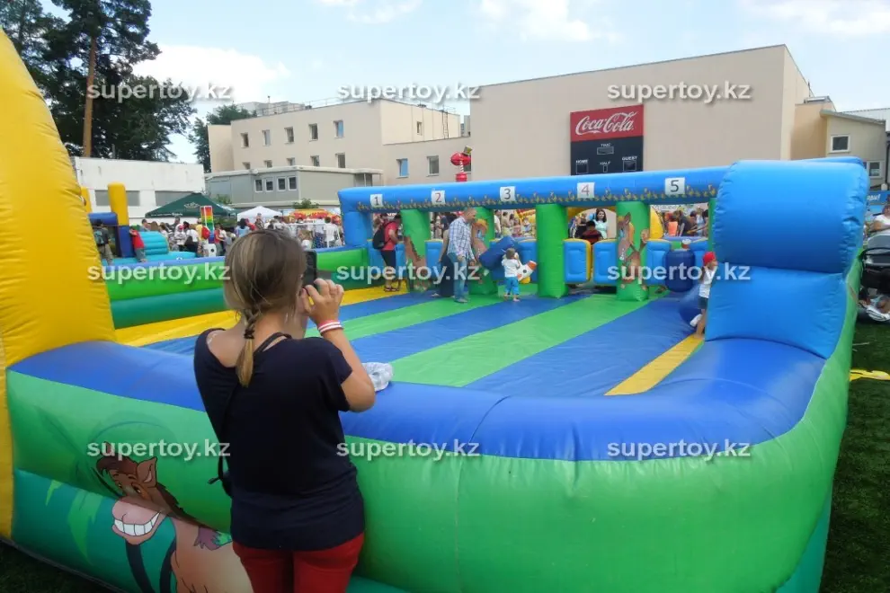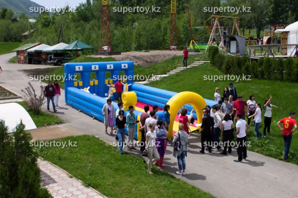 Новинка от компании «Супер Той» – аттракцион-батут «Скачки на надувных лошадях», который поднимет настроение на 100% и вызовет приступы смеха у всех! Это прекрасное решение для развлекательной программы летнего мероприятия: тимбилдинга, корпоратива, взрослого и детского Дня рождения, пикника на природе. Вас ждут шикарные скачки на очаровательных мустангах и море позитивных эмоций. Что представляет собой батут «Скачки на надувных лошадях»? Это огромный красочный аттракцион с бортиками, 6 надувными воротами, стартом и финишем. Каждому участнику выдается симпатичная лошадь, которая, при определенных стараниях, приведет игрока к желанной победе.