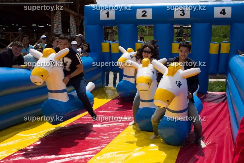 Заказать батут «Скачки на надувных лошадях» в аренду в Алматы Вы можете у нас – мы гарантируем чистоту и привлекательный, аккуратный внешний вид конструкции и всех ее элементов. Ну а восторг, который Вы получите от участия в этой забавной игре, просто неописуем!