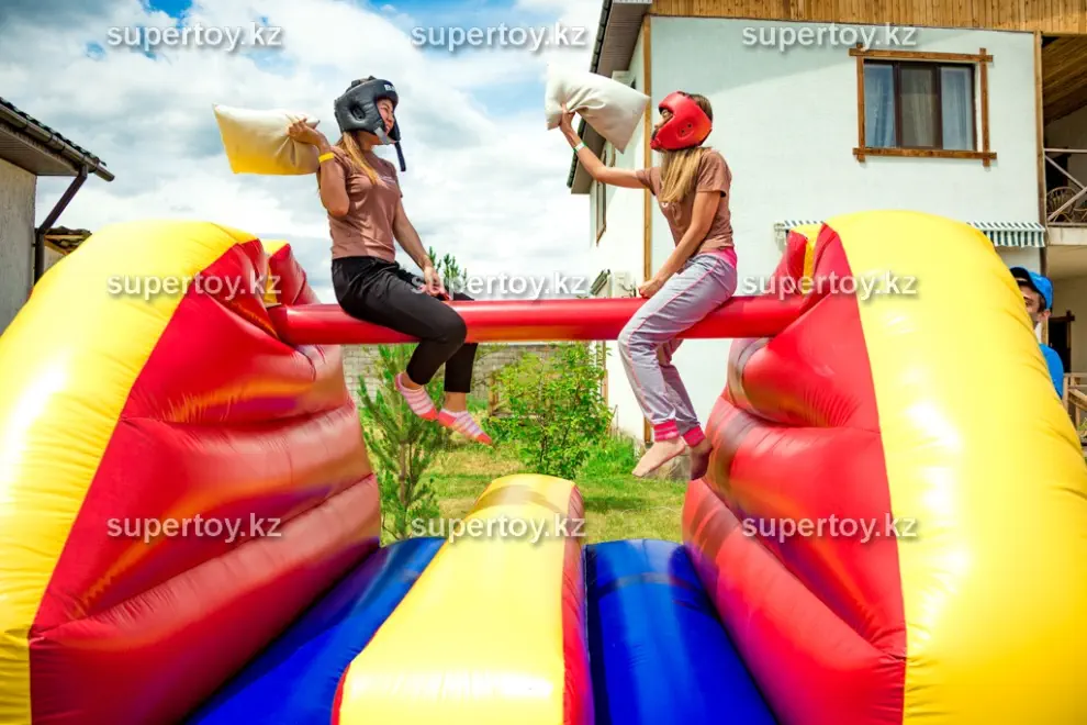 Аттракцион можно установить и в помещении, самое главное, чтобы было достаточно места для монтажа конструкции и отсутствие острых предметов. Конкурс «Бой на подушках» станет изюминкой любого мероприятия. В этом развлечении с большой радостью поучаствуют и малыши, и подростки, и взрослые гости. С первых же минут состязания у игроков просыпается азарт, они входят в кураж, и играть в бой подушками хочется все время! Данная забава перенесет Вас в детство и подарит незабываемые минуты искренней радости!