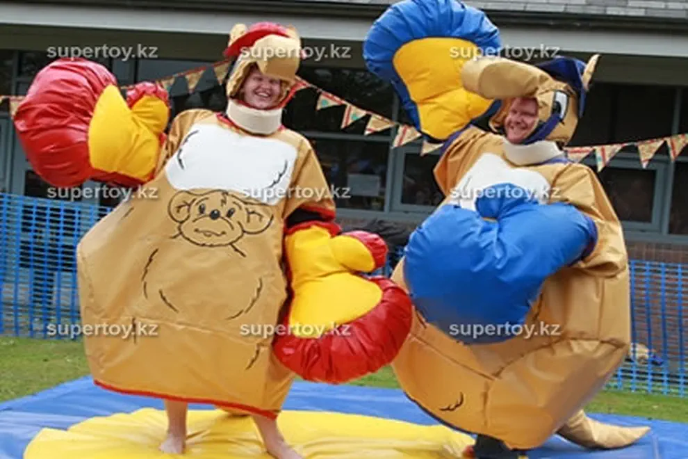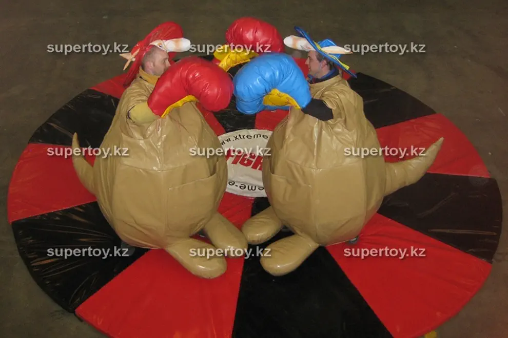 Наши клиенты знают и любят надувной батут «Бои сумо», аттракцион «Кенгуру» очень похож на него, однако есть определенные отличия. Вместо классических костюмов сумоистов участникам выдаются костюмы кенгуру и боксерские перчатки, в которых игроки и будут бороться. Костюмы изготовлены из качественного винила, имеют веселый привлекательный внешний вид, очень удобны. Также надежно предохраняют от ушибов. В такой спецодежде падать совершенно безопасно, тем более Вас защищает мягкий ринг. Заказать «Сумо-кенгуру» в Казахстане, Алматы Вы можете у нас, мы предоставляем работу инструктора на все время аренды. Он будет следить за соблюдением правил игры и техники безопасности.