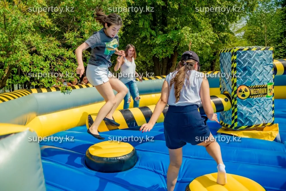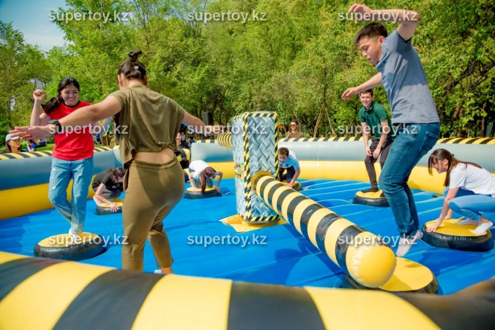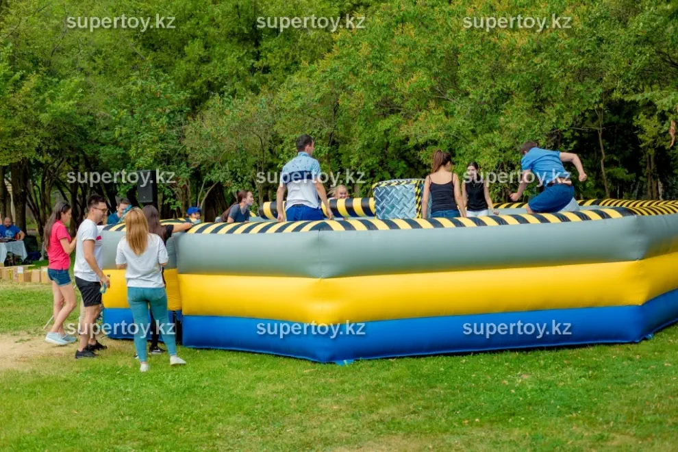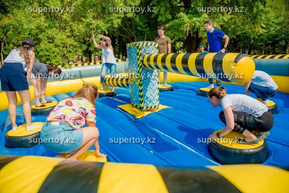 В ваше распоряжение поступает огромная надувная арена диаметром 9 метров. В ней вращаются две перекладины — на нижнем и верхнем уровне. Задача участников — устоять на своих площадках. Для этого нужно то проворно перепрыгивать надвигающееся препятствие, то подныривать под него. Победителем объявляется дольше всех продержавшийся боец. Думаете, на пружинистом подвижном основании сделать это просто? Закажите батут «Ниндзя» в «Супер Той» и попробуйте сами! Гарантируем — будет весело и азартно.