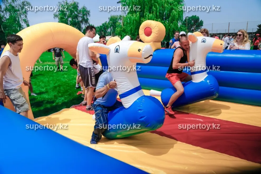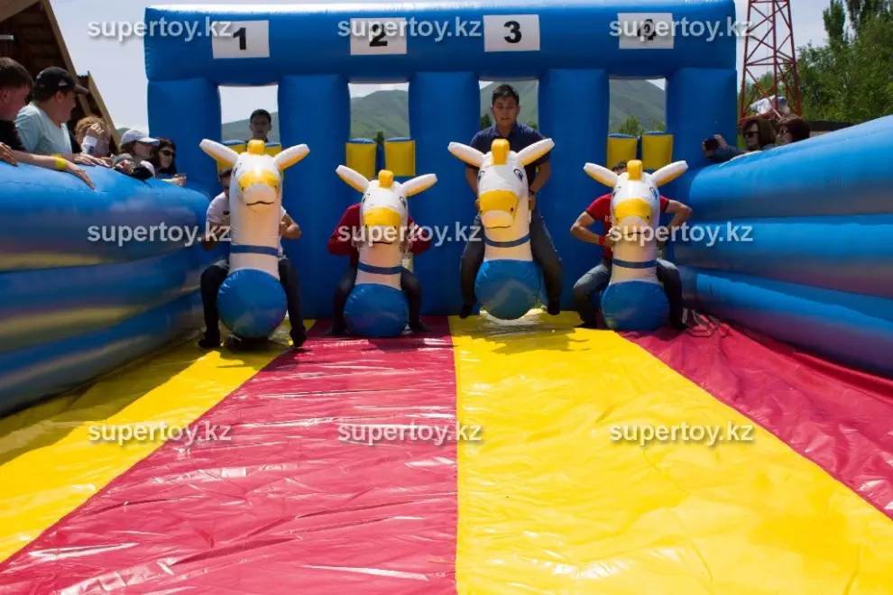 Новинка от компании «Супер Той» – аттракцион-батут «Скачки на надувных лошадях», который поднимет настроение на 100% и вызовет приступы смеха у всех! Это прекрасное решение для развлекательной программы летнего мероприятия: тимбилдинга, корпоратива, взрослого и детского Дня рождения, пикника на природе. Вас ждут шикарные скачки на очаровательных мустангах и море позитивных эмоций. Что представляет собой батут «Скачки на надувных лошадях»? Это огромный красочный аттракцион с бортиками, 6 надувными воротами, стартом и финишем. Каждому участнику выдается симпатичная лошадь, которая, при определенных стараниях, приведет игрока к желанной победе.